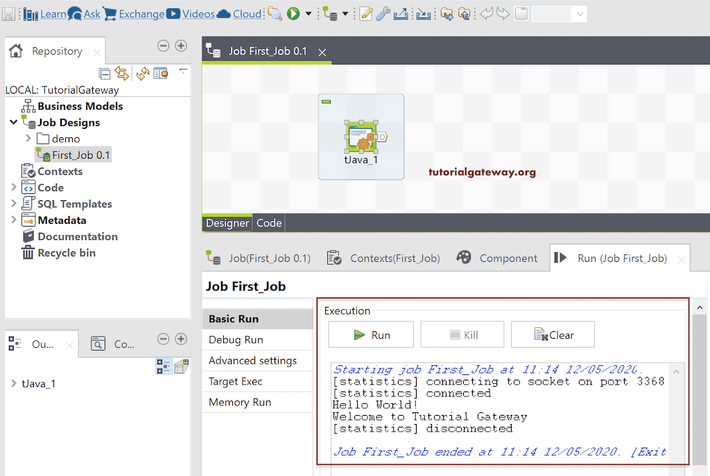 Now you can see our newly created job in the Repository Job Design section. To demonstrate the complete process of the Job design, we use a simple Custom Code field called tJava.