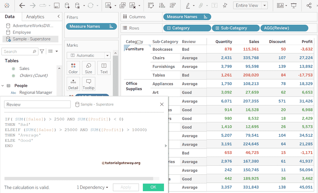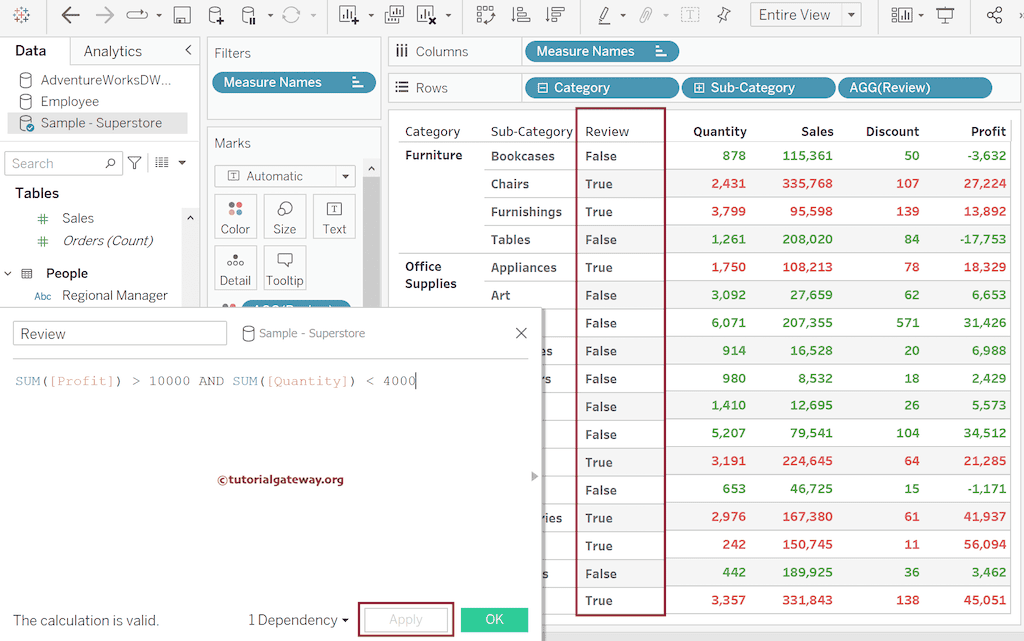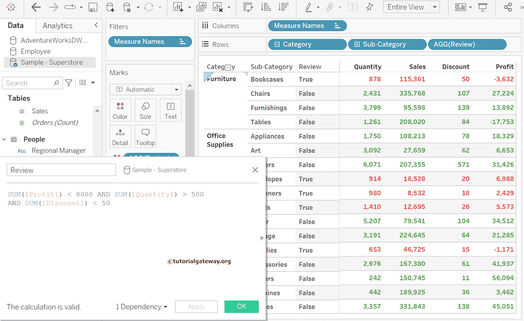 First, rename the calculated field as the Review. In this example, we will find the Sub-Categories with Negative Profits; the expression is as shown below.