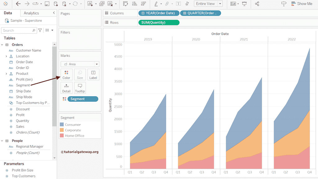 Click the plus button beside the Year to expand the column shelf’s date hierarchy. Now, you can see the Discrete Area Chart that displays the orders by year and quarter. Drag and drop the Segment field to the Color shelf to add colors to the discrete area chart.