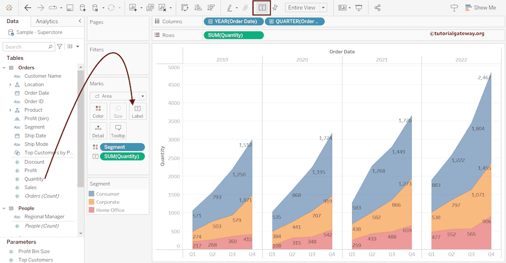 Click the T button or add the Quantity Measure Value to the Label Shelf to add data labels to the discrete area chart.