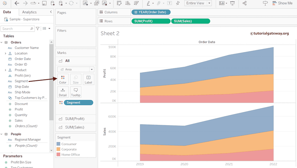 From the screenshot below, we have added the Segment field to the Color Shelf of All (sales and profit) to divide the area chart further.