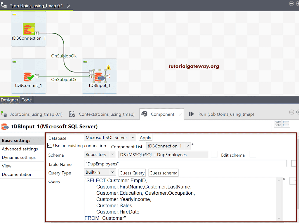 In this tMap Joins example, drag and drop the DBConnection and tDBCommit to establish a connection to SQL and close the same. Next, we used tDBInput to select the DupEmployees table from the Talend repository.